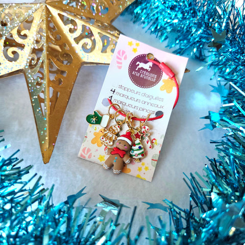 L'ensemble comprend 4 marqueurs sur anneaux et 1 bonhomme de pain d'épices sur pinces. Les anneaux dorés conviennent à des aiguilles jusqu'à 7.5mm. L'ensemble est aussi disponible exclusivement sur pinces dorées.