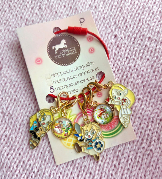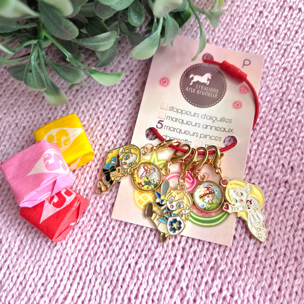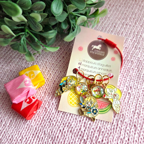 L'ensemble comprend 4 marqueurs sur anneaux et 1 sur pinces. Les anneaux dorés conviennent à des aiguilles jusqu'à 7.5mm. L'ensemble est aussi disponible exclusivement sur pinces dorées.