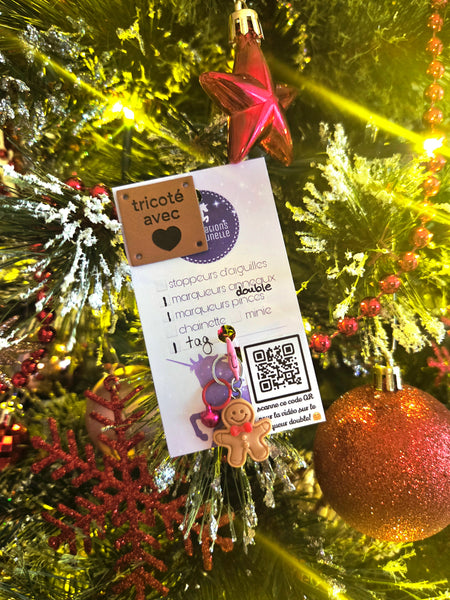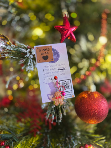 Un petit ensemble bonheur comprenant 1 marqueur à pince colorée, un marqueur double et une étiquette Tricoté avec amour!