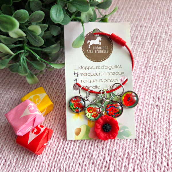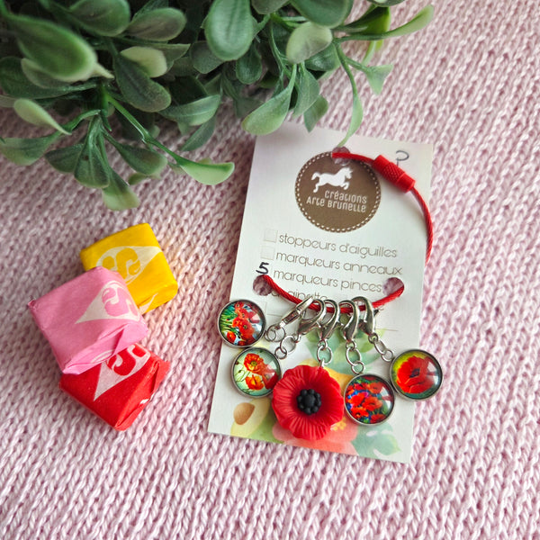 Cet ensemble floral comprend 5 Marqueurs de mailles, avec pour marqueur de progression central un magnifique coquelicot en résine! Les 4 dômes de verres imagés sont montés sur des bases en acier inoxidable. Les anneaux conviennent à des aiguilles jusqu'à 7.5mm.
